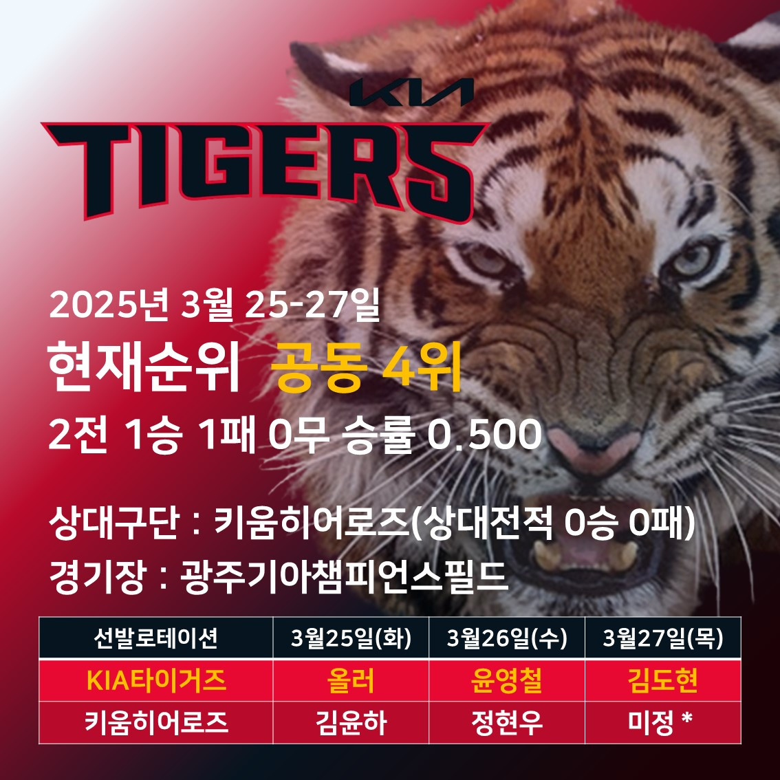 키움히어로즈의 공격력만큼은 무시할 수준이 아니다. 주축이 신인 위주로 꾸려져 있다고 하지만 신인선수들의 페이스가 떨어지는 건 체력저하가 일어날 시즌 중반 이후의 일이지 지금은 충분한 체력을 바탕으로 더 겁없이 덤벼들 수 있는 상황이다. 특히 3월 26일 등판할 정현우의 경우는 프로 선수들도 쉽게 공략하기 어려운, 까다로운 볼을 던지는 것으로 알려져 있다. 3연전 전체가 경기 초반 분위기 싸움이 될 가능성이 높은데 KIA타이거즈 입장에서는 전반적으로 가라앉은 타격페이스를 끌어올려 줄 선수가 필요하다.
