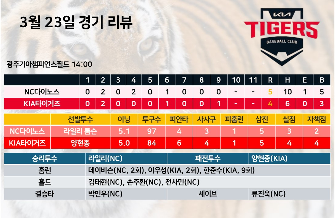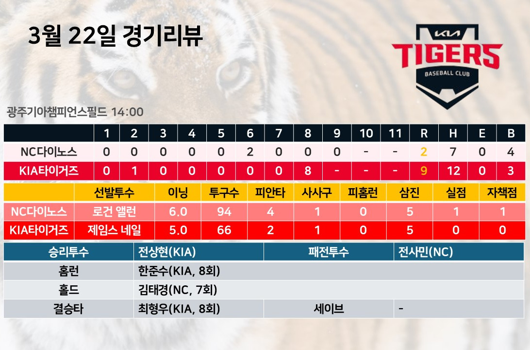 NC다이노스가 잘 풀어낸 건 아닌데 KIA타이거즈가 공격에서 제대로 된 활로를 찾지 못했던 경기라서 다시금 김도영의 빈자리가 아쉽게 느껴졌다. 이럴 때일수록 기존 선수들이 제 몫을 조금씩만 더 해주면 되는데 아직까지 타선이 전반적으로 컨디션이 올라오지 못했다 싶다. 시즌 극초반, 고작 두 경기 한 것에 불과하지만 이번 시즌 초반 경기 스케쥴이 지난해 9위, 10위, 8위와 잡혀 있다는 건 만약 이 때 불의의 일격을 당하면 이걸 만회하는데 그만큼 시간이 오래 소요될 가능성이 높다는 뜻도 된다. 특히 다음주 키움히어로즈와의 경기는 도리어 KIA타이거즈 쪽에 부담감이 더 심할 수 있는 경기다. 이미 이번 시즌 순위경쟁팀인 삼성라이온즈와 LG트윈스가 개막시리즈 2연전을 모두 이긴 상황이라 더욱 분발이 필요하다.
