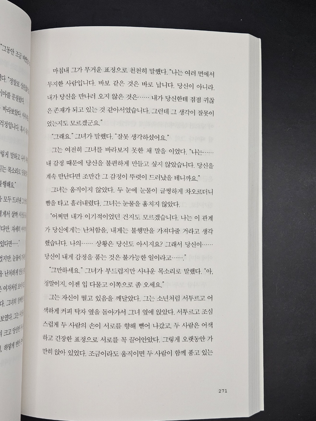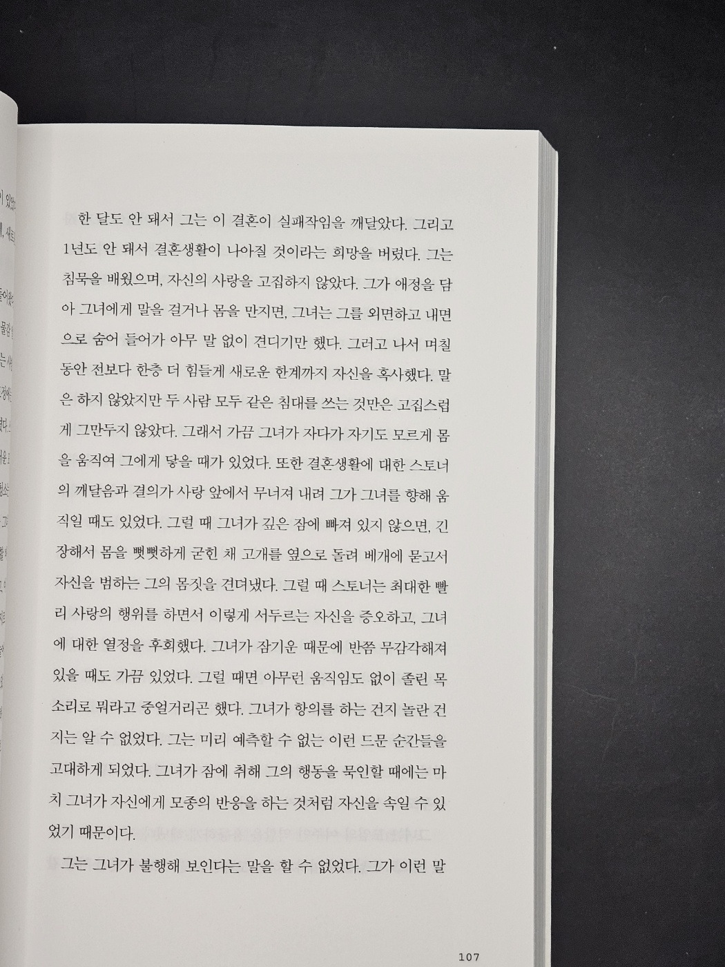 이야기의 템포와 나의 리듬이 맞아 떨어지기까지 시간이 걸리는 편이다. 마음을 확 끌어당기는 무언가도 존재하지 않는다. 특히 아내와의 갈등이 천천히 차오르는 부분을 읽다보면 안들어도 결말이 훤히 보이는 일일드라마식 파경 아닌가 싶어서 솔직히 실망스러울 정도다.