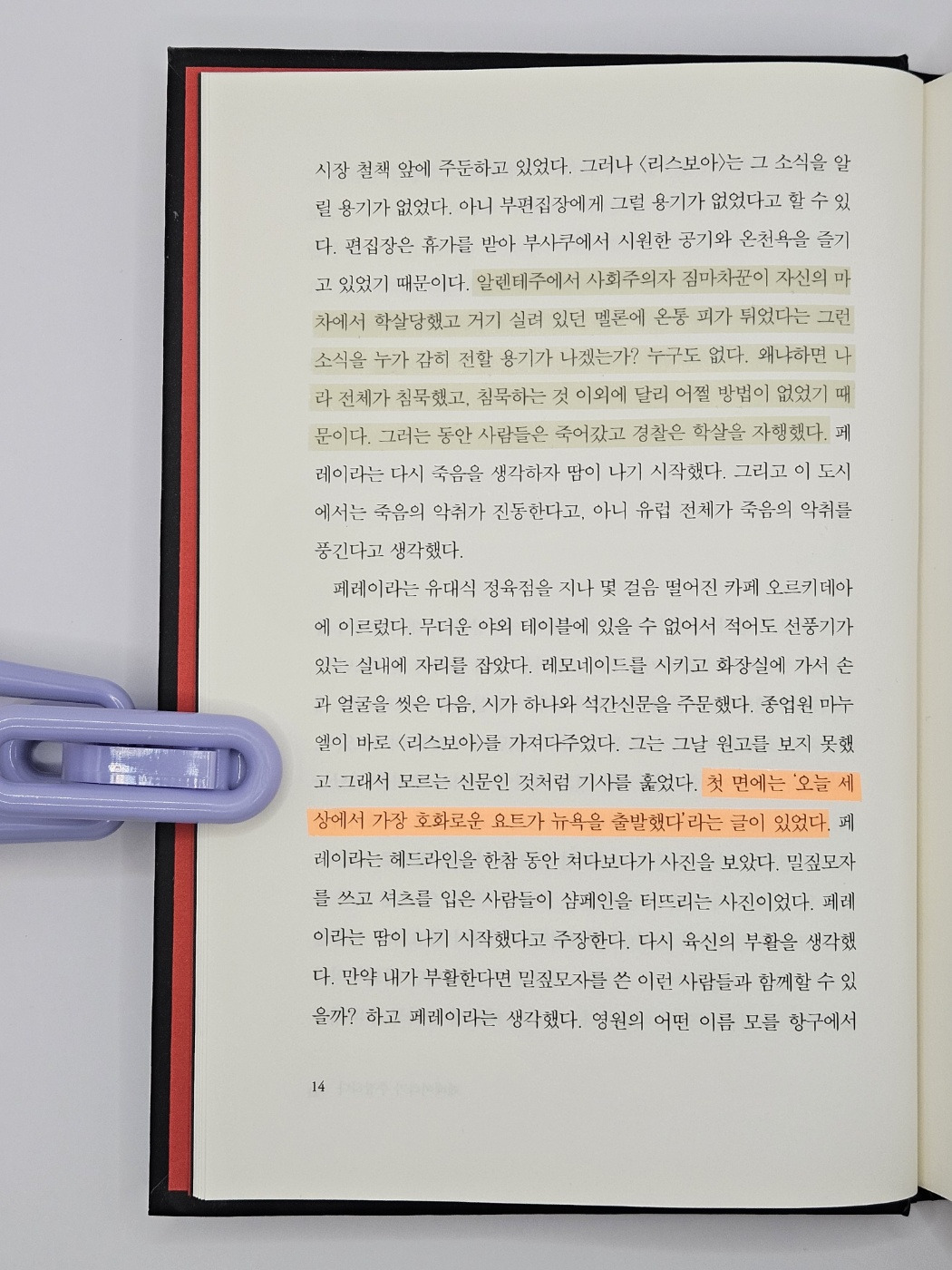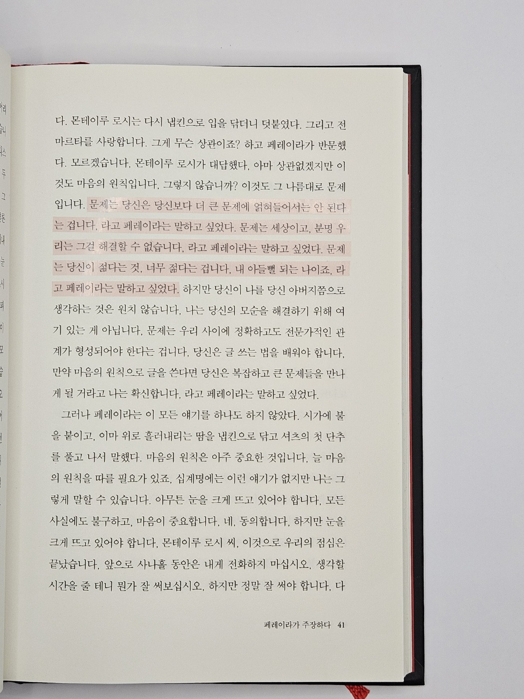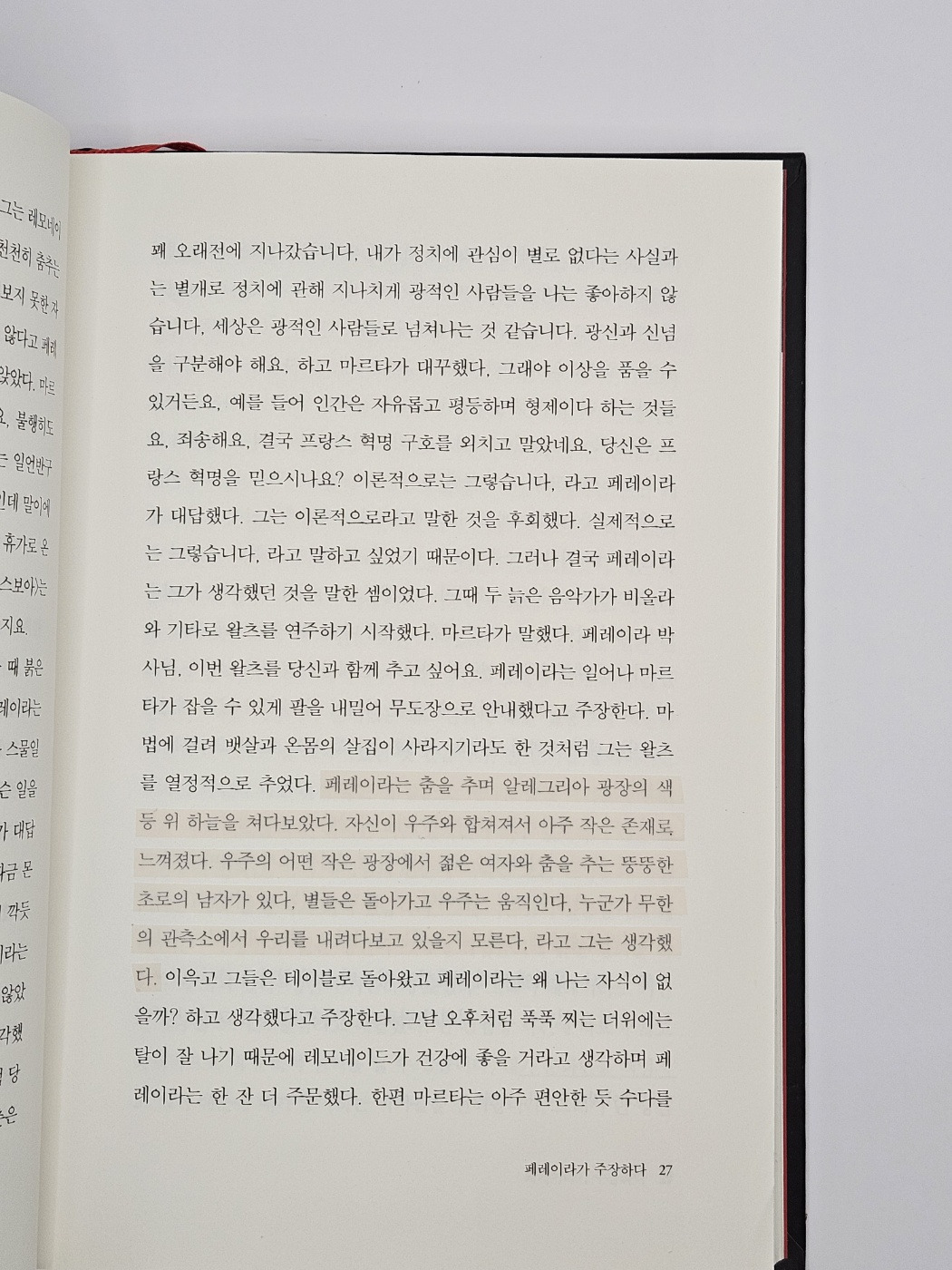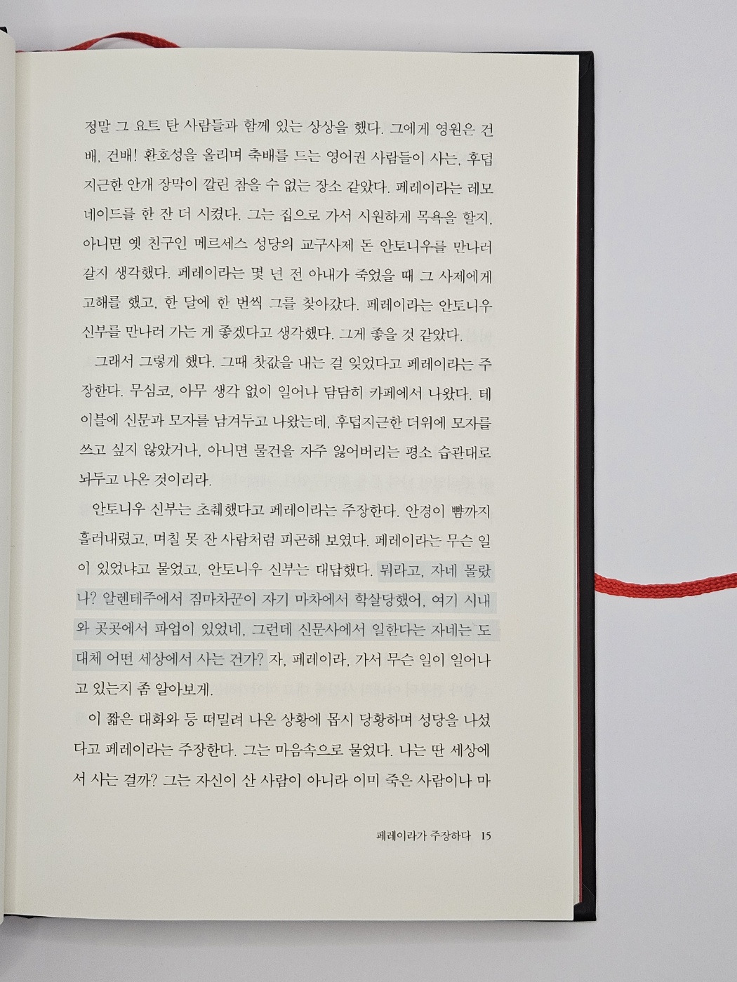 페레이라는 편집장에게 인사하고 전화를 끊었다. 안토니우 페루, 페레이라는 생각했다, 그 끔찍한 안토니우 페루, 가장 나쁜 점은 그가 교활한 지식인이라는 것이었다. 그가 페르난두 페소아의 친구였다는 데 생각이 미쳤지만 페소아도 결국 그런 이상한 친구를 택했다는 사실을 받아들여야 했다.