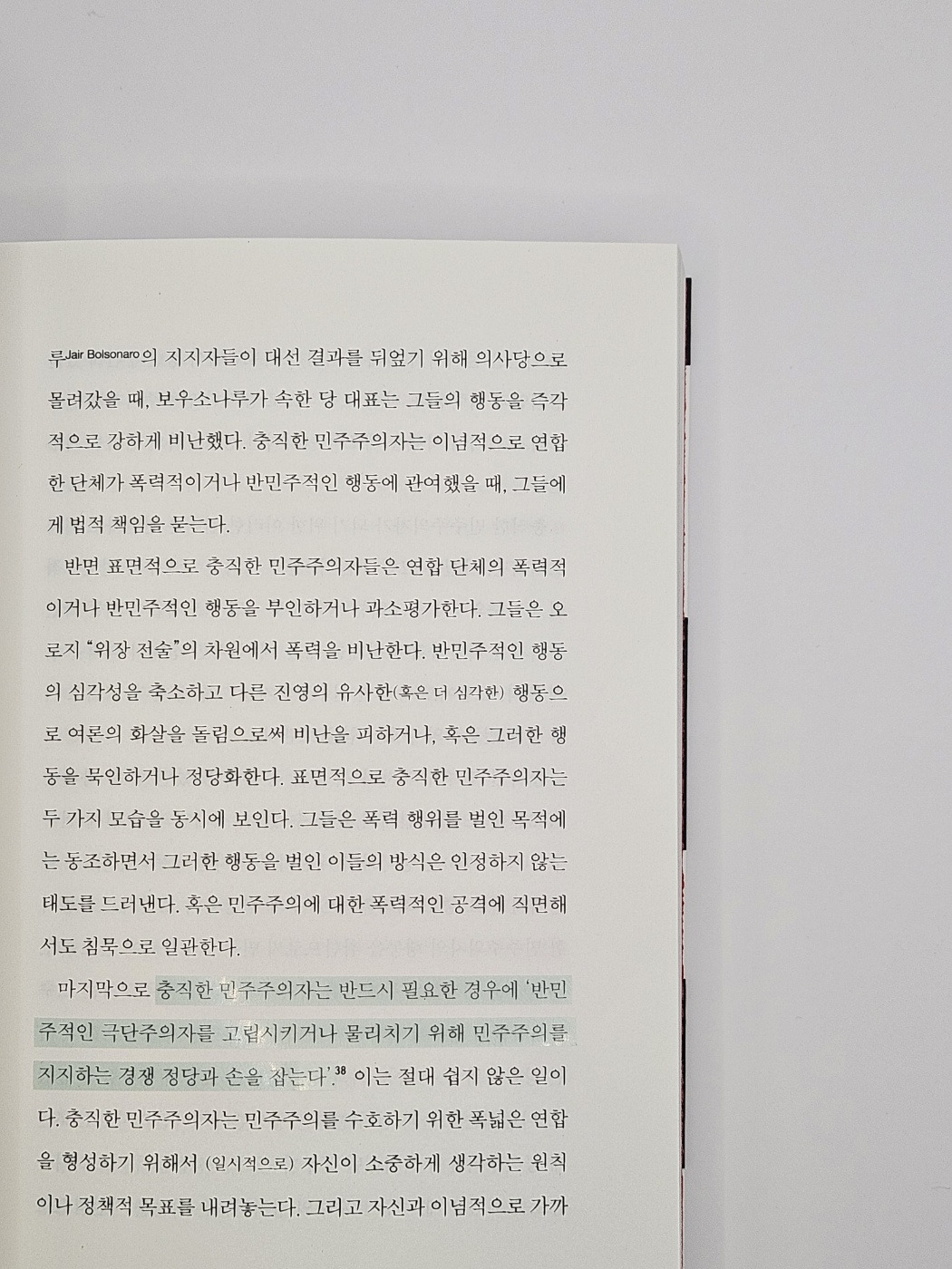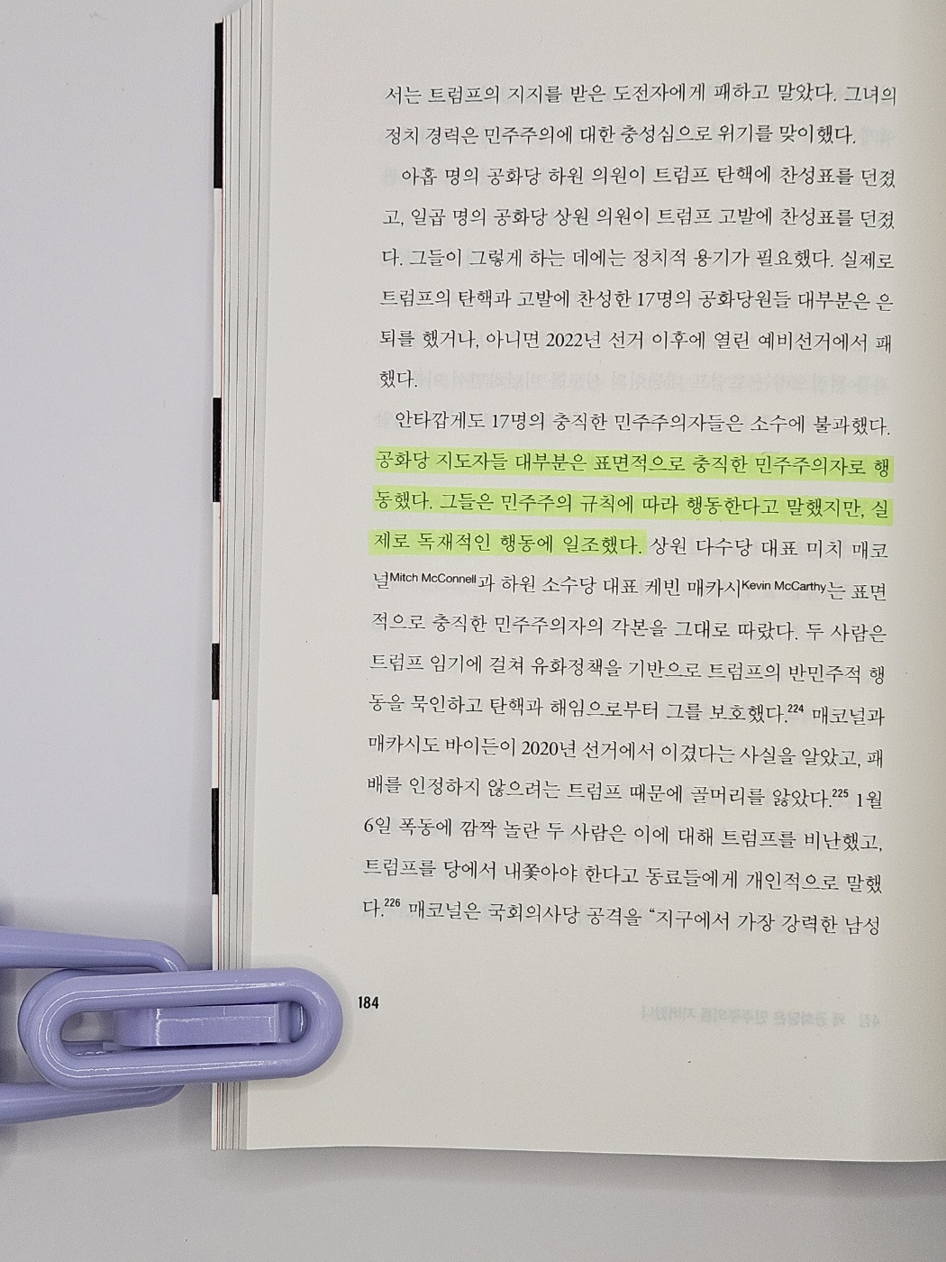 2. 스티븐 레비츠키와 대니얼 지블릿의 전작인 「어떻게 민주주의는 무너지는가」는 트럼프의 기묘한 등장을 두고 쓰여졌고, 이 책은 트럼프의 충격적인 퇴장을 보며 쓰여진 책이다. 물론 이들은 트럼프가 다시 복귀할 수 있다는 사실(트럼프 본인이 복귀를 하든, 트럼프의 대리인이 복귀를 하든)을 염두에 두고 책을 저술한 것으로 보인다.
