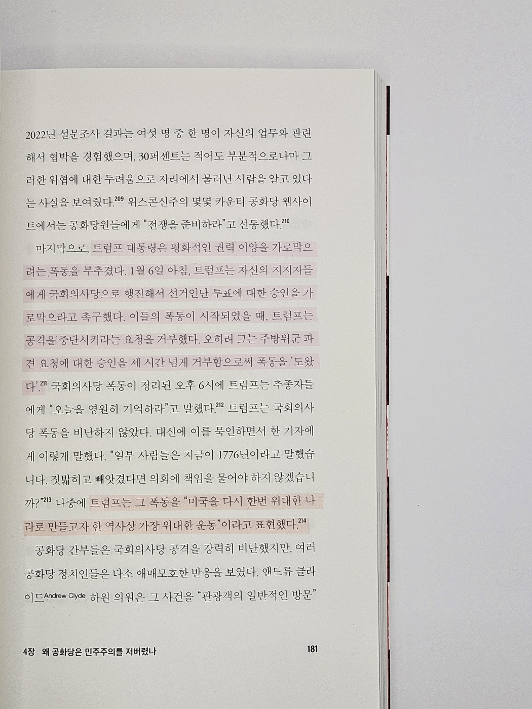 4, 그렇기 때문에 이 책은 단순히 '지금 미국에서 이런 일이 벌어지고 있습니다.'가 아니라 당장 우리의 현실에서도 벌어지고 있는 민주주의의 붕괴에 대해서 적나라하게 다루고 있는 책이 된다.