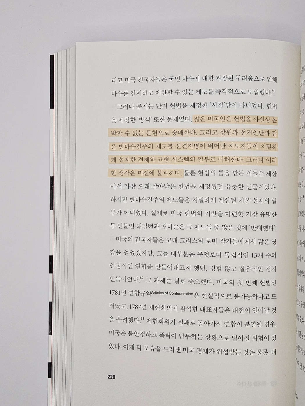 자꾸 전작 얘기를 하게 되어 죄송한데, 전작인 「어떻게 민주주의는 무너지는가」는 사실 책을 다 읽고 곰곰히 생각해보면 민주주의의 붕괴를 말하는 책이 아닌 것처럼 느껴진다. 책을 읽다보면 저자들은 사람들의 머릿속에 들어있는 통념을 무너뜨리는 데 재미가 들린 사람들처럼 보인다. 저자들이 던진 공에 내 머릿속에 서 있던 생각들은 볼링핀처럼 쓸려나간다.