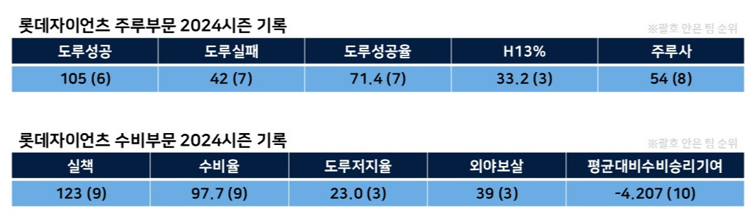 여기에 도무지 깨질 것 같지 않았던 시즌 202안타의 레이예스와 나름 베테랑 역할을 충실하게 수행해낸 전준우까지. 24시즌 롯데 자이언츠는 장타력은 조금 부족하지만 상대를 계속 몰아치며 그로기 상태로 몰아넣는 공격력을 뽐냈다.