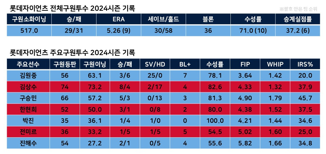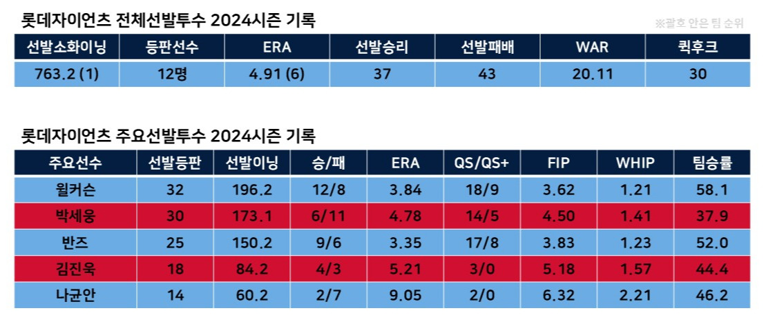그런 의미에서 24시즌의 윌커슨과 박세웅이 조금 더 좋은 평가를 받아야 한다고 난 생각한다. 이 두 선수가 이닝 소화를 못해줬다면 롯데 불펜진은 그야말로 최악의 상태로 빠져들었을 가능성이 높다. 반대로 롯데 불펜진이 더 탄탄했다면 이 선수들의 체력관리가 용이했을 테고 결국 조금 더 나은 성적을 올리지 않았을까 생각해본다.