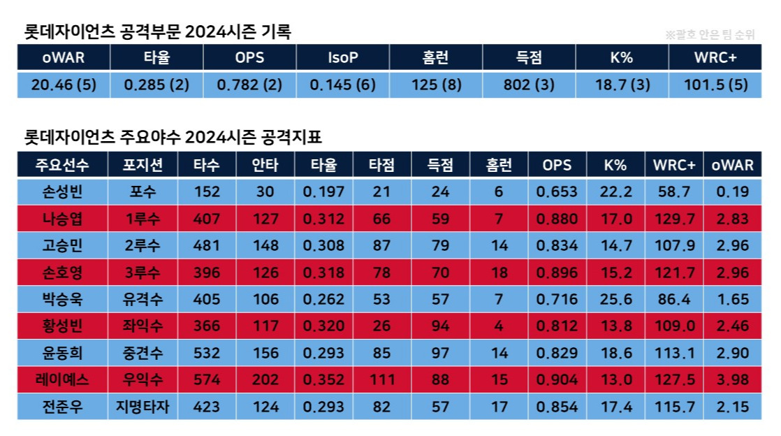 방금 전 롯데 김태형 감독을 무슨 금지어가 될 감독인 양 씹어댔는데, 구분선 하나 건너오고 나니 이제는 찬양을 해야 할 판이다. 이래서 올 시즌 롯데가 도무지 정리가 안된다고 했던 거다. 팀 공격부문에서 24시즌 롯데 자이언츠는 23시즌에 비해 전부문 상승을 이뤄냈다. oWAR은 전체 7위에서 5위로, 타율은 4위에서 2위로, OPS는 8위에서 2위로, 순장타율은 9위에서 6위로, 홈런은 9위에서 8위로, 득점은 6위에서 3위로, wRC+도 7위에서 5위로 상승했다. 다른 건 몰라도 김태형이 야수를 보는 눈 하나만큼은 리그 어떤 감독보다 정확하다는 걸 입증한 시즌이었다.