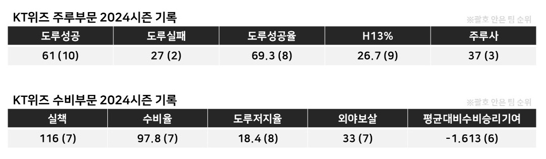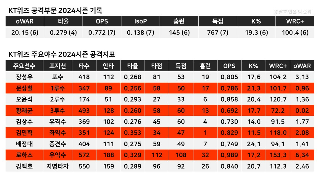 KT 위즈 주전 야수들의 평균연령이 은퇴선수들로 이루어진 최강야구보다 높다는 이야기를 들은 적이 있다. 직접 계산해본 적이 없으니 맞는 이야기인지까지는 모르겠으나, 수치를 보면 주전 야수들의 노쇠화가 드러난다. 얼핏 보면 안정적으로 보이지만 실상은 소극적인 거다. 수치가 전반적으로 중하위권이다. 소극적인 태도는 키움 히어로즈에서도 느껴지는데, 그 팀은 젊기 때문에 언제라도 팀 컬러를 바꾸려고 시도할 수 있는 반면, KT는 그런 가능성조차 보이지 않는 것이 문제다.