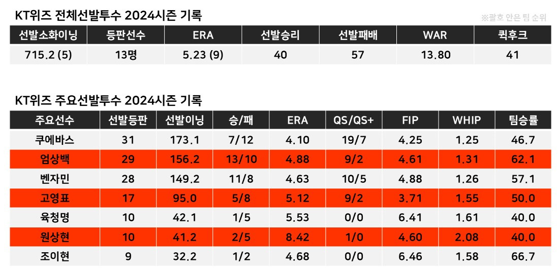 KT의 최대 강점이 무엇인가 물으면 머릿속에 바로 선발투수진이라 떠올리는 야구팬들이 많을 거다. 큰 경기에서 강렬한 모습을 여러차례 보여준 장수 외국인투수 쿠에바스를 중심으로 전문가들에게서 '리그를 씹어먹을 기량'이라 종종 평가받은 벤자민, 이 뒤를 '고퀄스' 고영표가 받치고, 신인왕 출신의 소형준과 엄상백, 배제성까지. 이름값 있는 선수들만 늘어놓아도 이미 5선발을 채우고도 남는게 KT의 선발진이다.