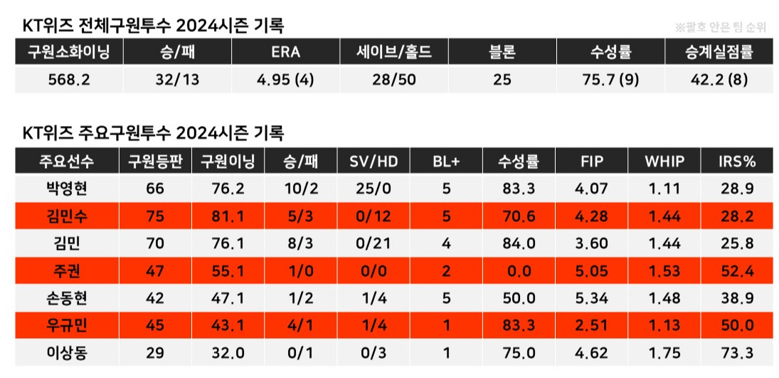 이 와중에 그나마 빛난 것이 FA로이드를 맞은 엄상백이었다. 그러나 엄상백의 세부지표 역시 '국내1선발-팀3선발' 정도 수준보다는 팀 4선발 정도의 활약이라 봐야 맞다. 엄상백은 제 몫을 했다. 그 이상이라고 보기는 힘들다. 주변이 제 몫을 못해서 빛난 활약이 되었다는 건 KT 선발진이 예상보다 더 허약했다는 방증이다.