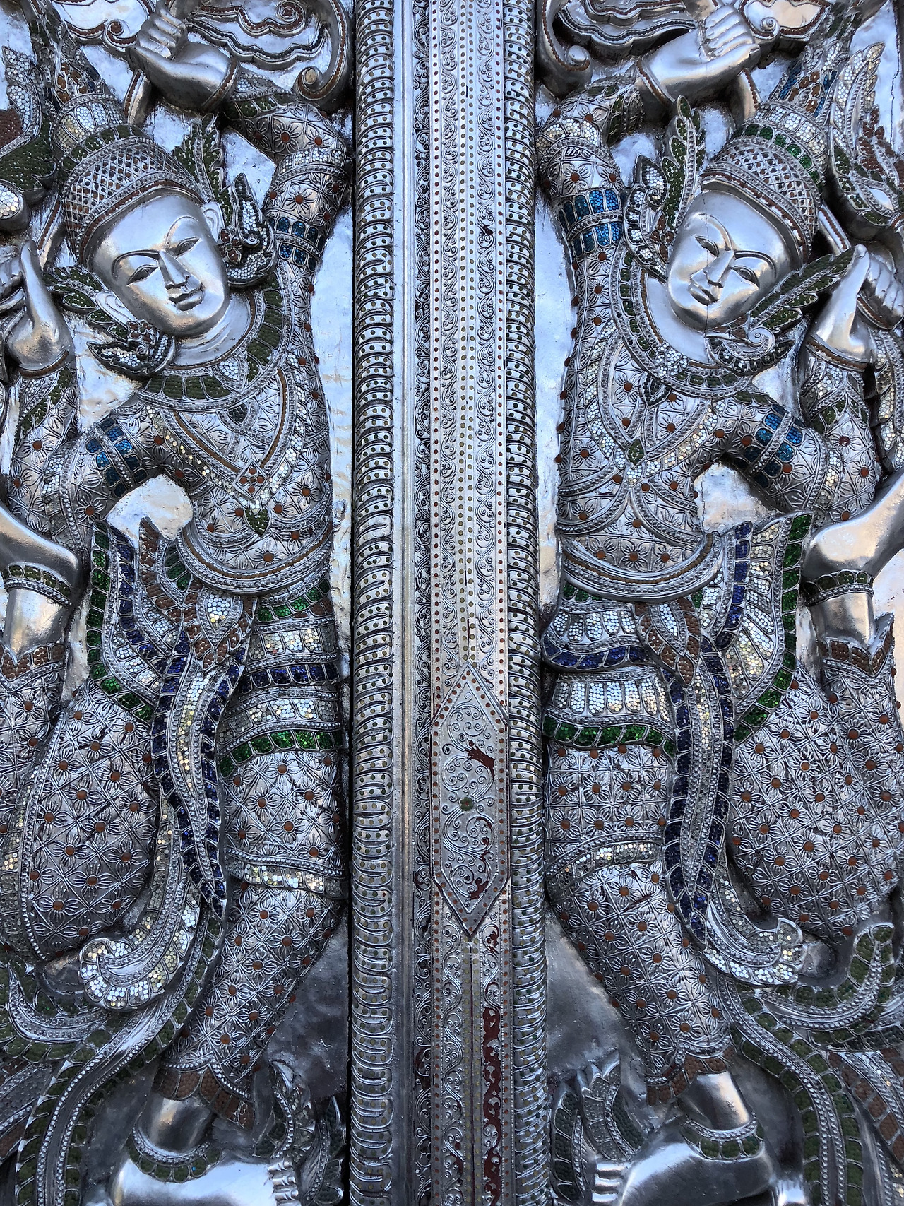지나가다 문이 은으로 된 곳에 잠시 머물러 사진을 찍었는데 뒤에 알고 보니 이 곳은 세계 최초의 은 사원인 왓 수리스판이라나 뭐라나 사원이다. 여성은 출입 불가라니 어차피 우리는 알아도 못 들어가는 곳이어서 미련은 없다.