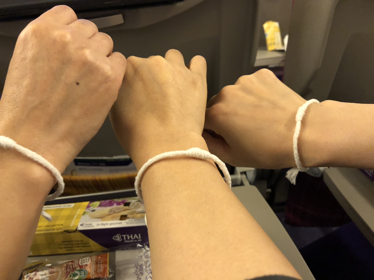 사원을 떠나기 전 마지막 의식으로 스님이 방문객들을 축원하며 하얀 실을 손목에 매어 주신다.