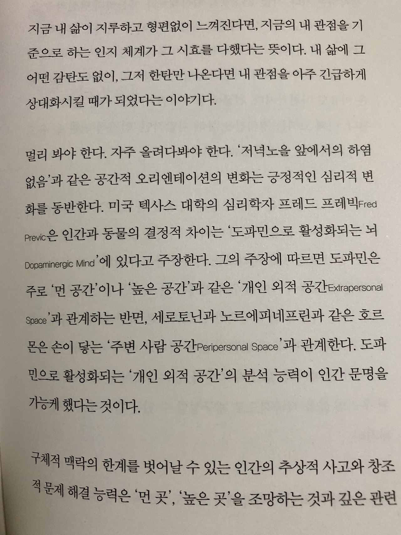 멀리 봐야 하고 자주 올려다봐야 한다는 작가는 이를 도파민과 연관 짓는다. 행복감을 느끼게 해주는 도파민은 먼 공간, 높은 공간과 관계 지어 있다니 참 흥미롭다.