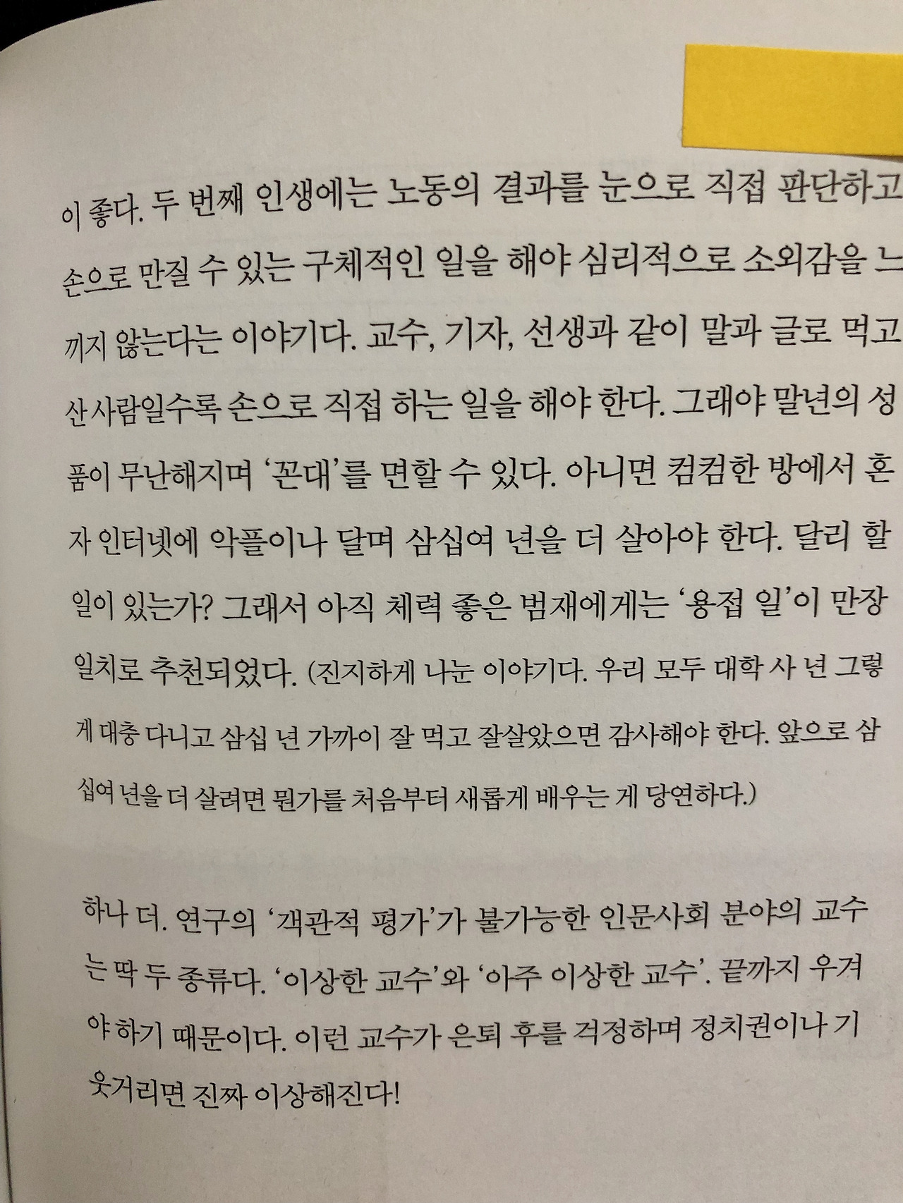 김정운 작가는 여태껏 머리로 먹고 산 사람들은 두 번째 인생에는 손으로 할 수 있는 구체적인 일을 해야 심리적으로 소외감을 느끼지 않을 것이라고 한다. 해서 회사를 나온 그의 친구에게는 '용접일'을 추천해주었다고 한다.
