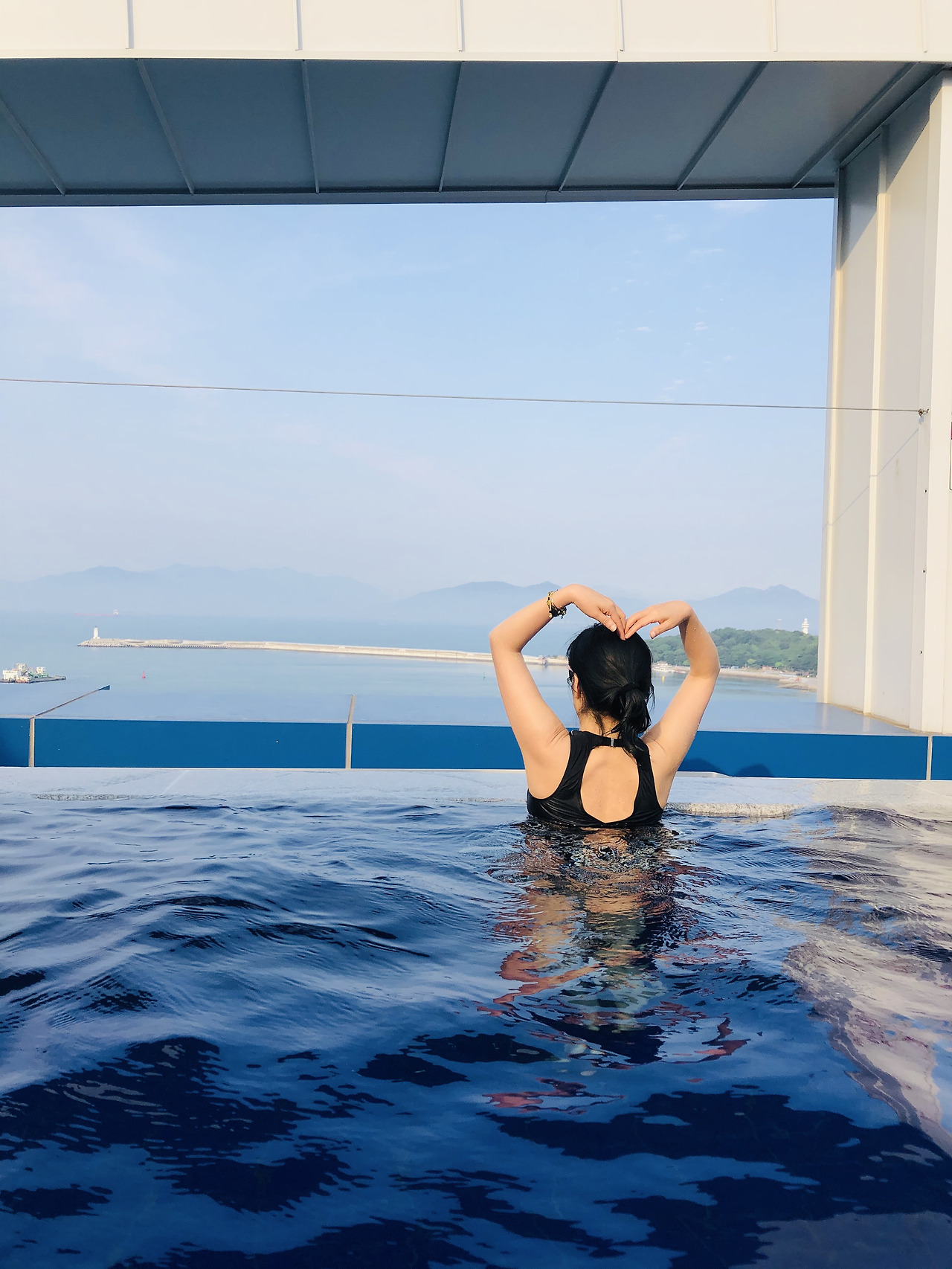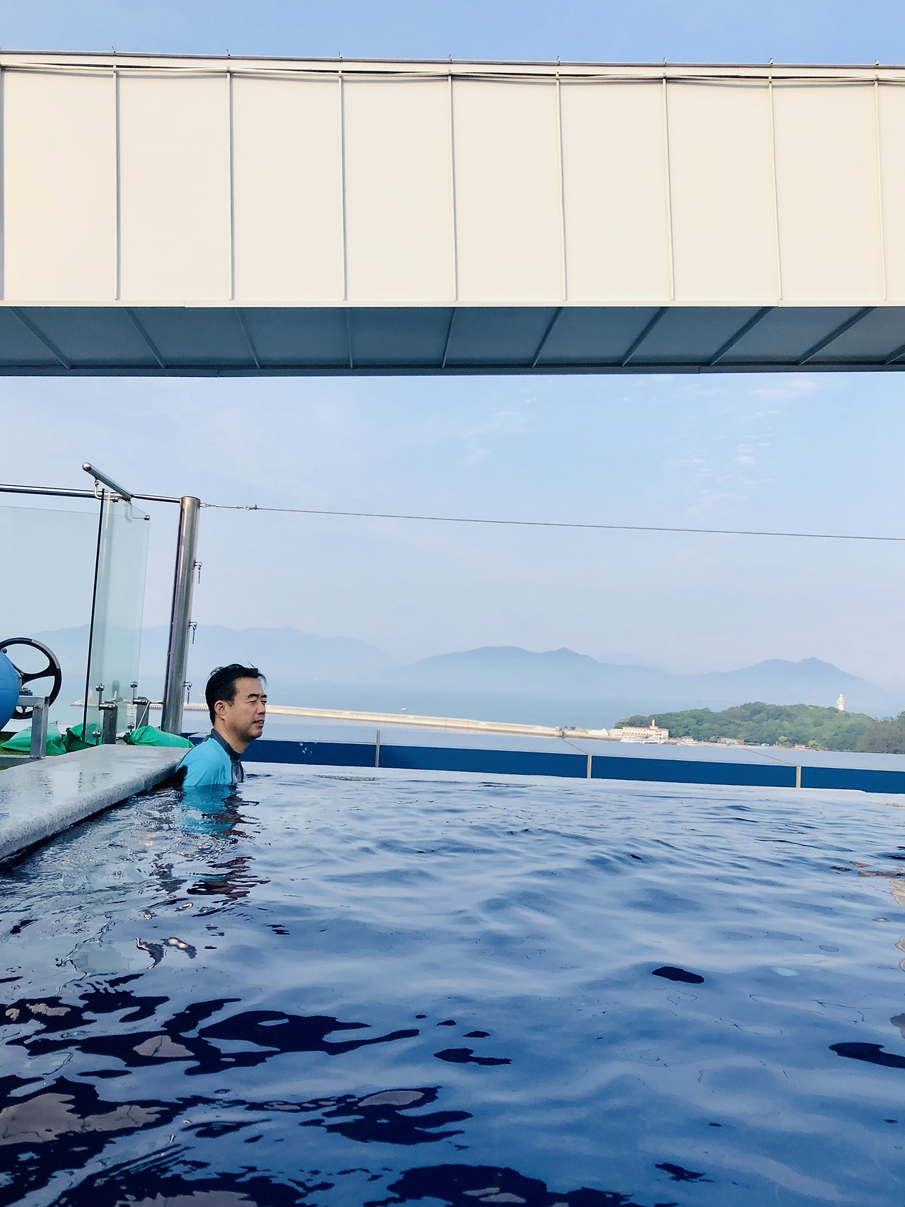 사람 없는 루프탑 풀에서 수영하며 하늘을 정면으로 보니 좋았다.