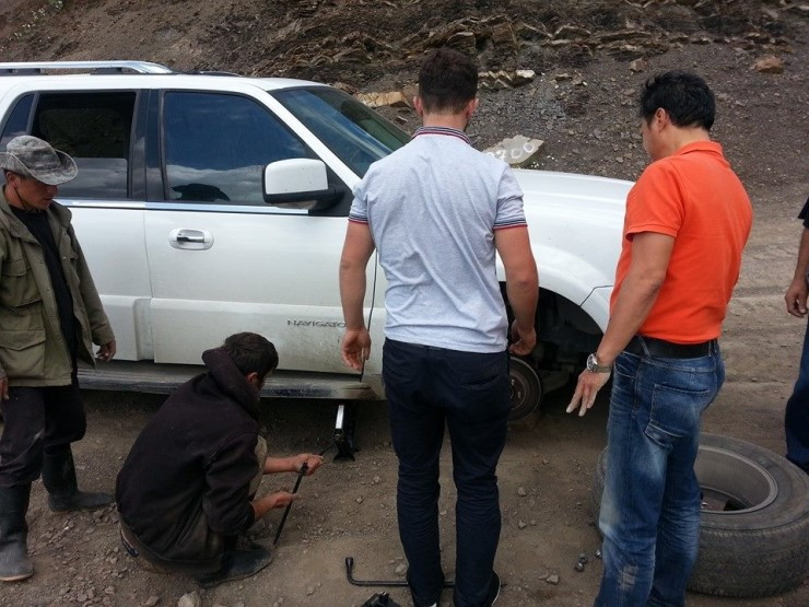 그중 제일 젊은 남자가 열심히 설명하며 으쌰 으쌰 하더니 타이어 교체에 드디어 성공한다.
