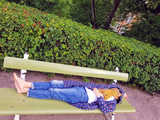 모자를 쓰고 스카프로 입을 가린 채 잠시 공원 벤치에 누워 깜빡 잠이 들었는데 으스스 한기가 느껴진다.