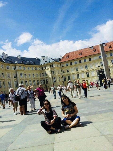 프라하성까지 올라오느라 다리가 아픈지 프라하성 입구 광장에 퍼질러 앉은 지나와 제니..