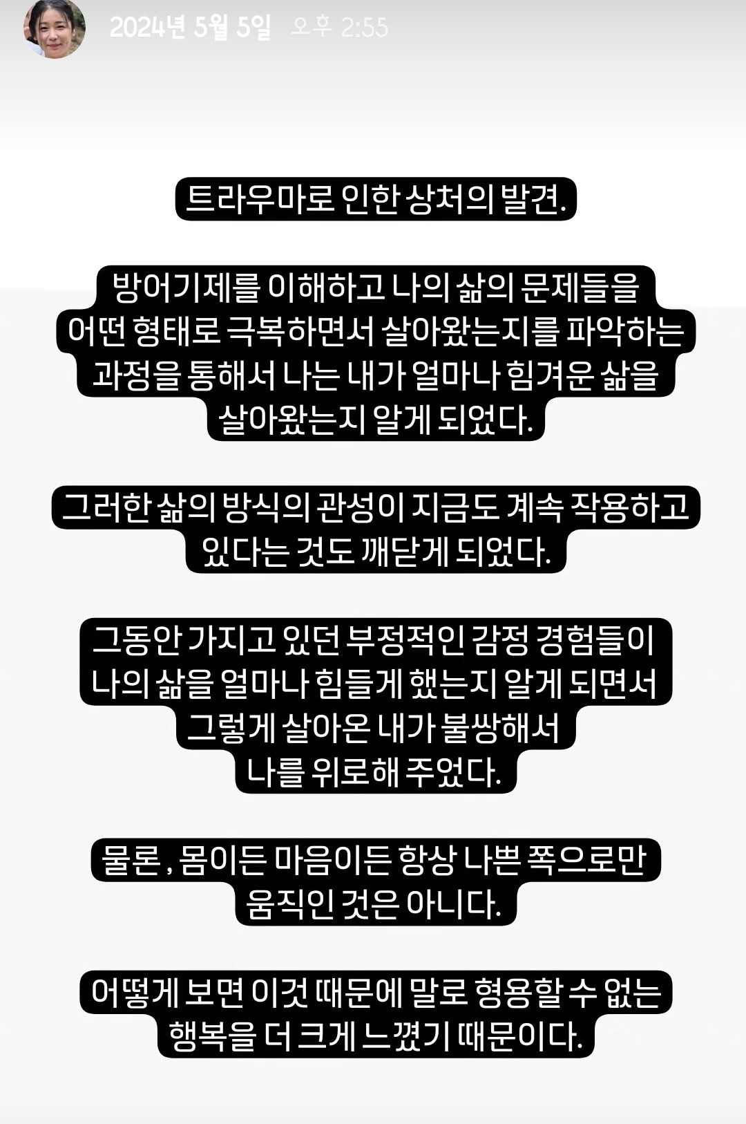 고통이 ‘잠시 외출 중’인 상태였을 뿐 행복하지 않았다.