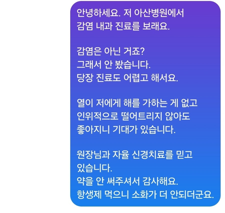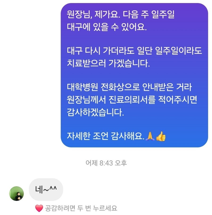치료를 중단해 컨디션이 안 좋을때면 대구에 있는 주치의 선생님께 얼른 달려가고 싶었다.