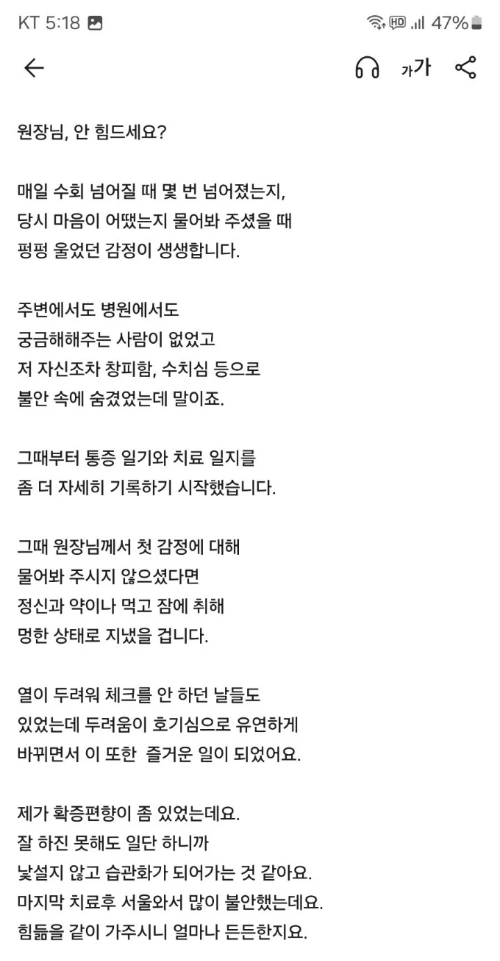 특히 환자로서, 자주 투명 인간처럼 느껴지는 의료 시스템 안에서 누군가 나를 감정으로 기억하고 있다는 경험은 말로 건네는 위로보다 훨씬 깊고 따뜻한 연결이었다.