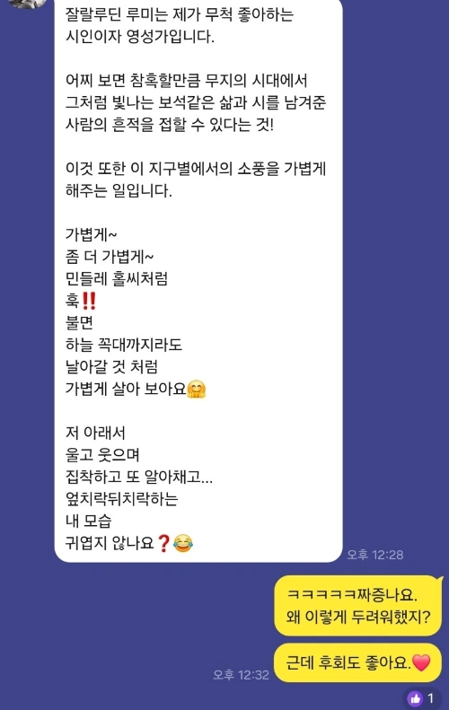 조금 더 유연하고 가볍게 살아보자는 그 아름다운 메시지 앞에서는 마음이 뭉개질 수 없었다.