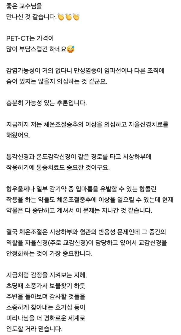 그냥 ‘좋으셨군요’ 한마디로 끝낼 수도 있었을 텐데 일면식도 없는 교수님을 "밥 한번 사드릴 정도로 좋은 분"이라고 표현하는 의사 선생님이 내 앞에 있다니 머리가 멍해졌다.