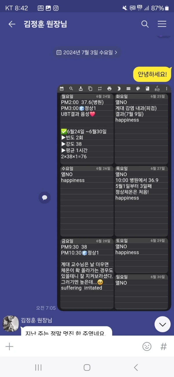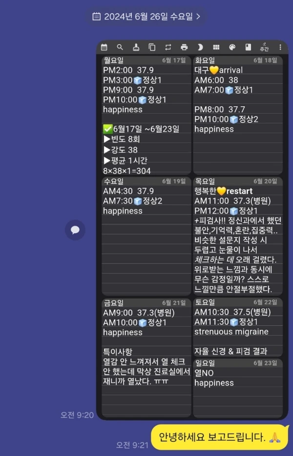 그래서 나도 2024년 5월부터 2025년 1월까지 발열에 대한 기록을 빠짐없이 보내드렸다.