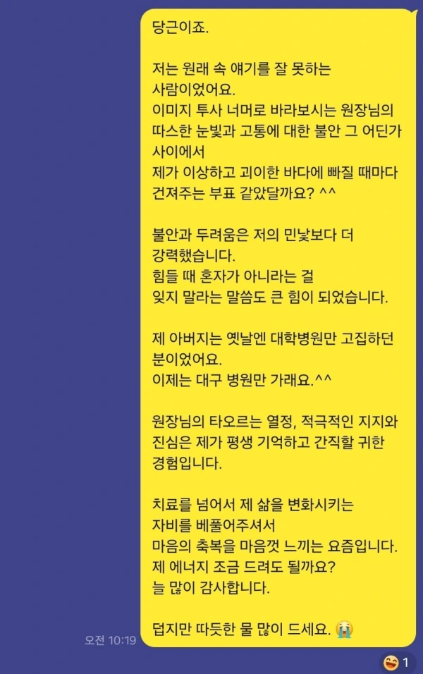 이래라저래라 좀 심각한 꼰대 의사를 만난 적이 있던 나는, 동행의 태도를 고수하시며 혼자가 아니라 함께 걷고 있다는 확신을 주신 덕분에 강요 없는 치료 환경에 마음을 열 수 있었다.