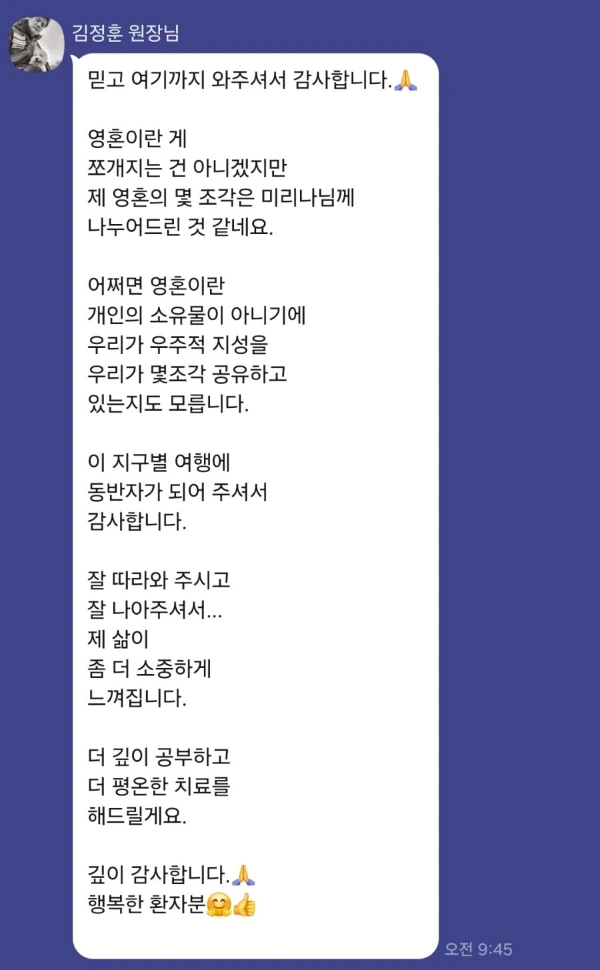 그런데 같은 길을 걷는 여행자로 봐주시는 원장님의 톡에 눈물이 왈칵 쏟아졌다.