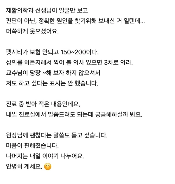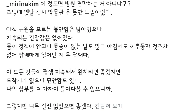 그래서 처음 나를 진료했던 나의 상태를 가장 잘 아는 주치의 선생님께 진짜 괜찮다는 확신을 신뢰하는 사람의 입으로 듣고 싶었다.