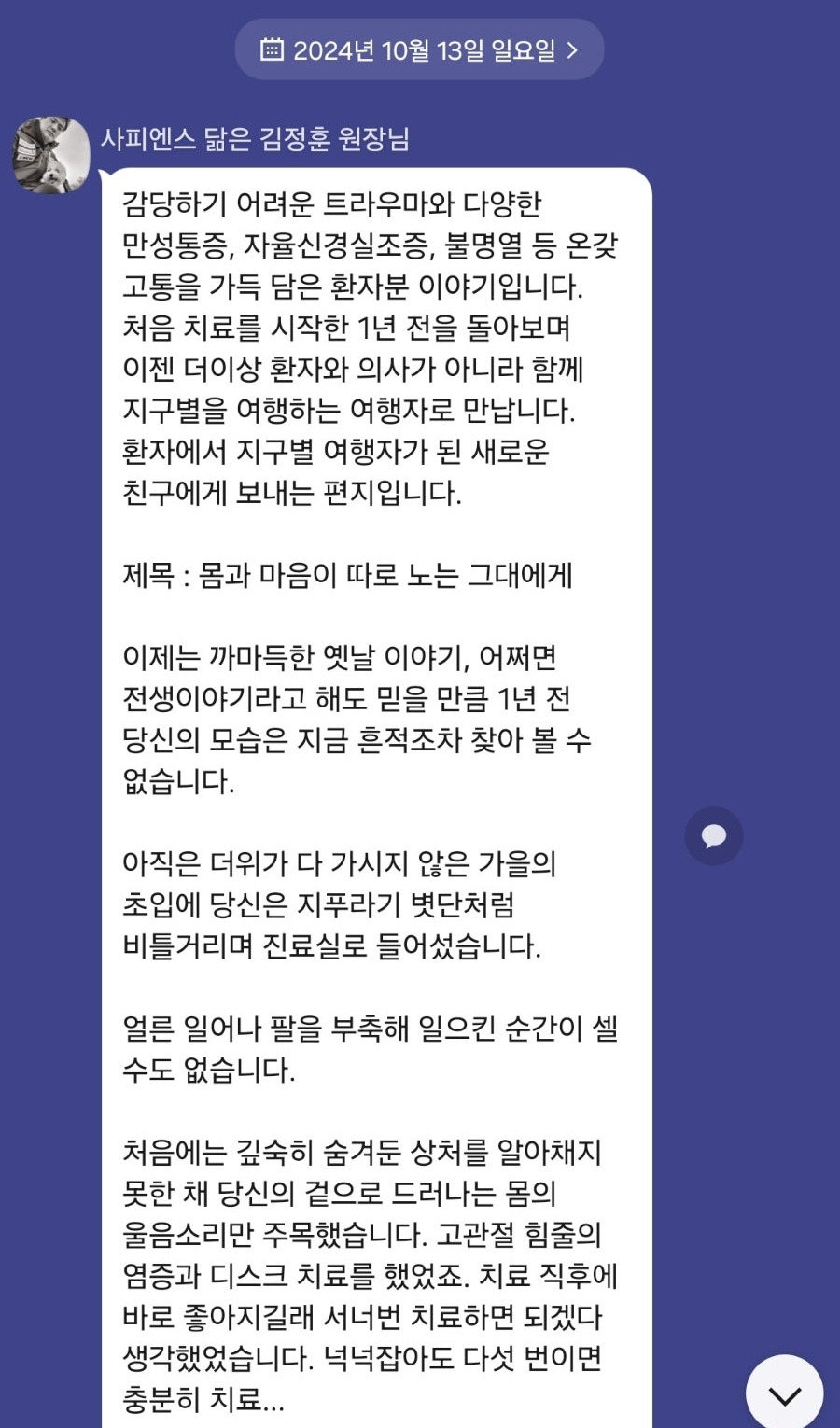 지구에서 가장 행복한 김정훈 의사 선생님은 통증을 치료하는 데 그치지 않았다. 내가 내 몸과 마음의 언어를 다시 읽고 회복의 말을 만들어갈 수 있도록 도와주셨다.