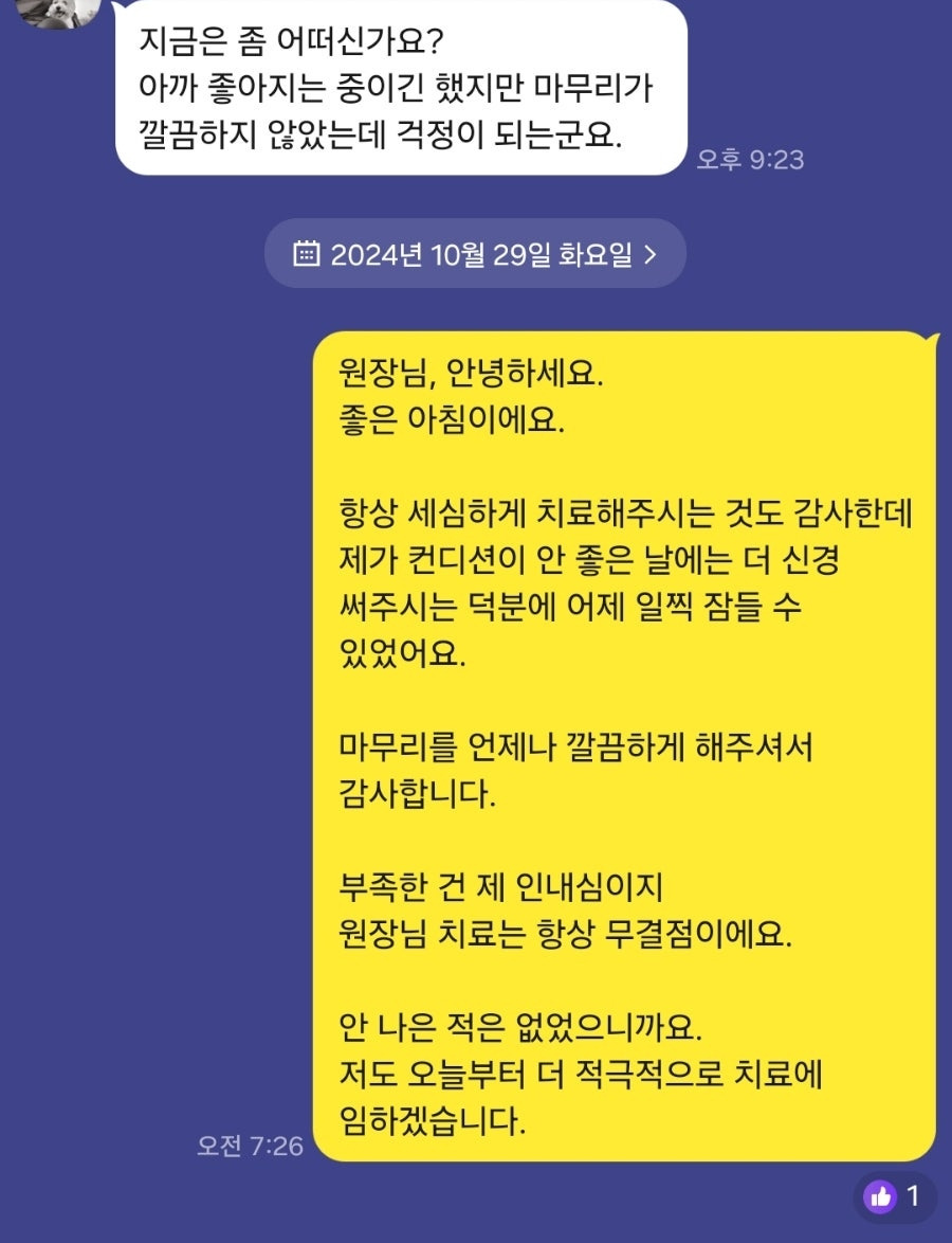 “오늘 치료가 충분하지 않아 보여서요. 지금은 좀 어떠세요?”