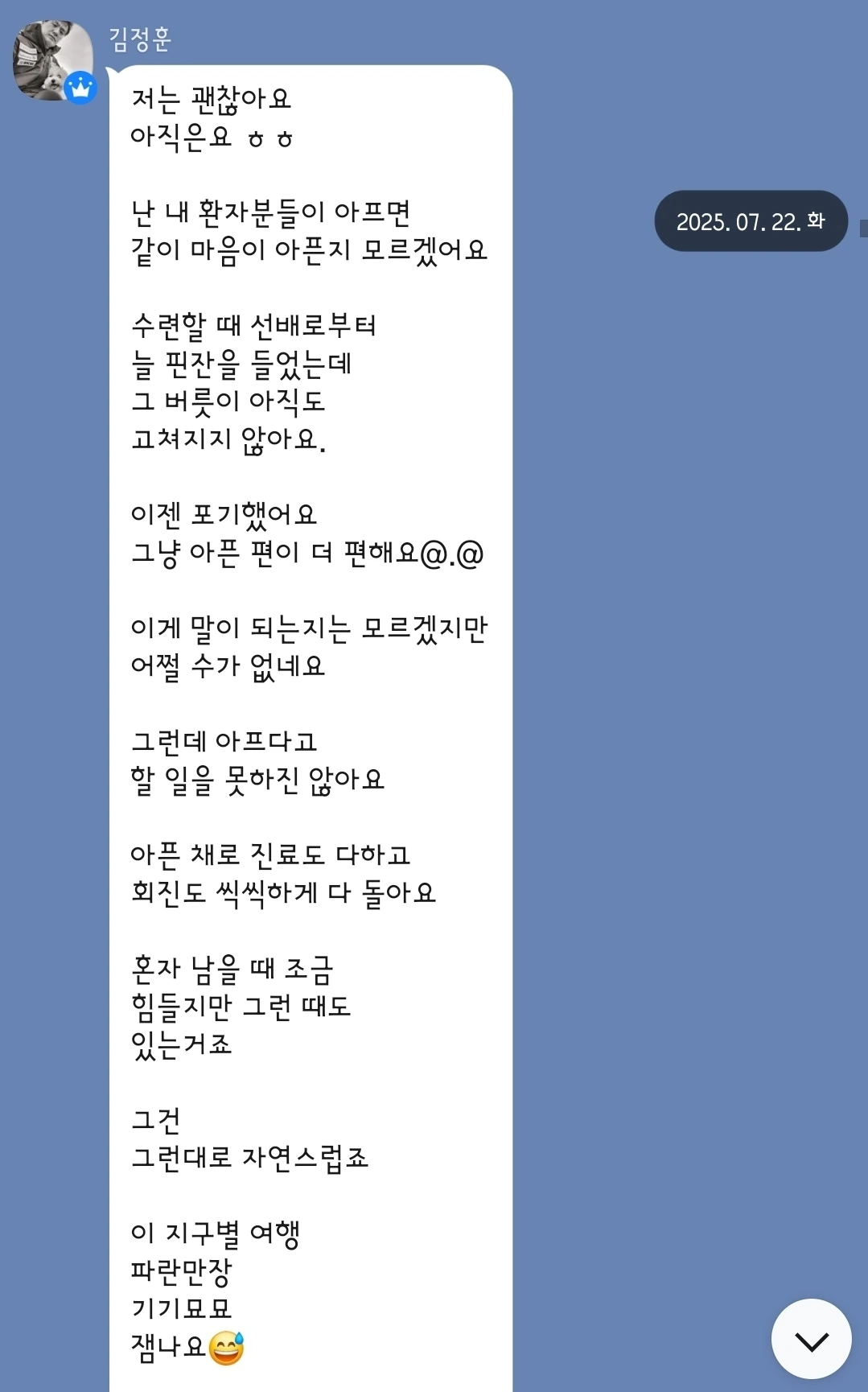 몇 달 전 만성통증, 암환우 단톡방에 원장님 건강에 대해 안부를 묻자 이렇게 답을 하셨다.