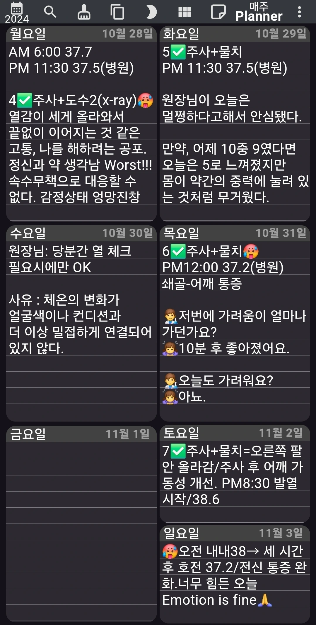 아직도 37도를 넘기면, 그때가 생각하지만 이제는 덜 무섭다. 통증이 와도, 불안이 와도 버틴다. 매일의 통증, 발열 상태를 기록하지 않아도 괜찮다.