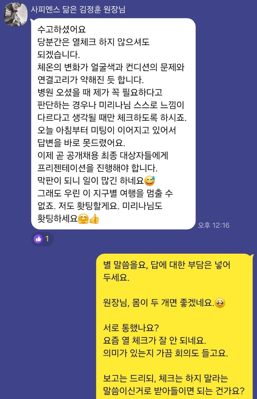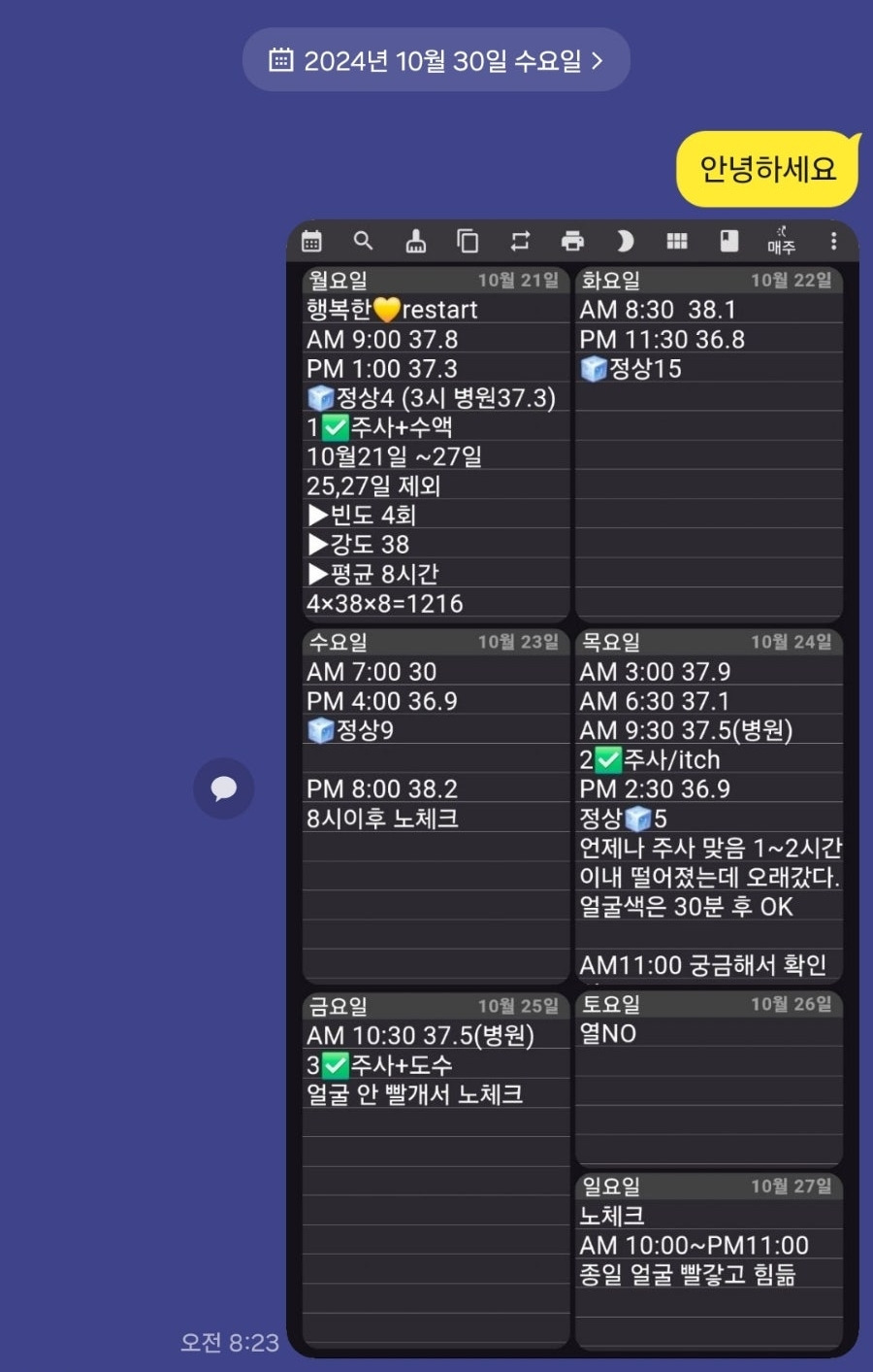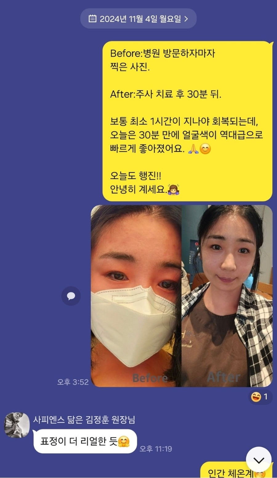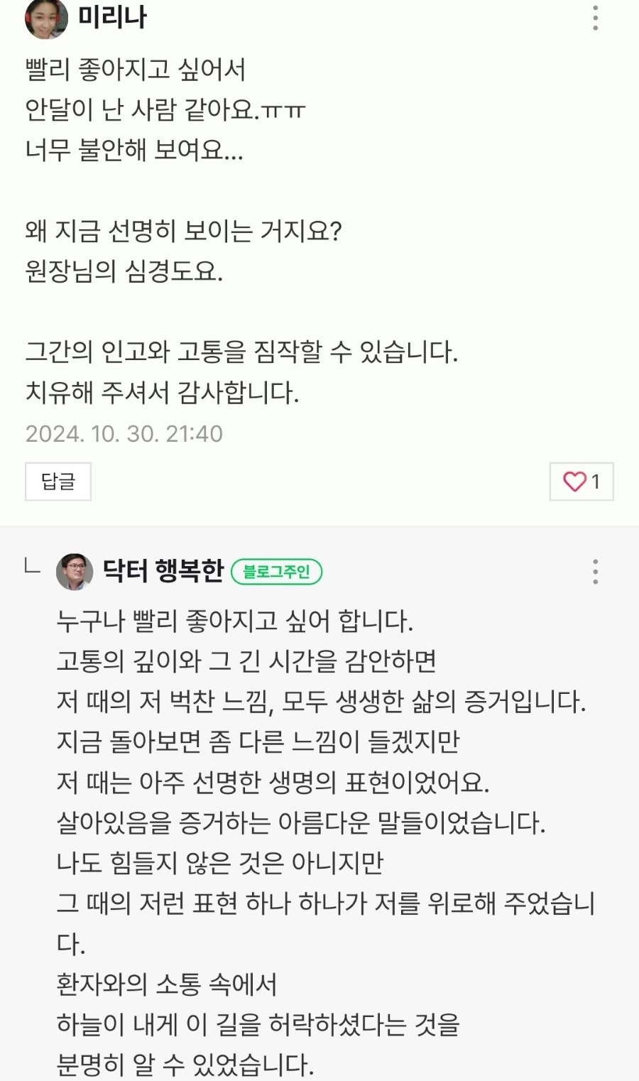 원장님은 늘 회복할 수 있는 상태로 가는 것을 목표로 해주셨고 발열감이 조절되면 주사 횟수를 줄이는 쪽으로 유도해 주셨다. 나는 그때 더없이 신뢰했다.