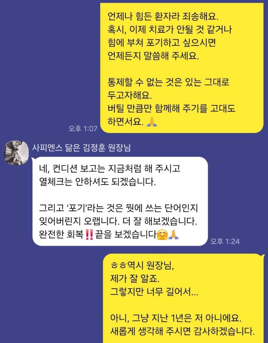 나라는 사람이 짐이 되지 않길 바라는 간절함이 있었기에 이제 치료가 안 될 것 같거나 힘에 부쳐 포기하고 싶으시면 언제든 말씀해 주세요. 라고 말씀드렸다.