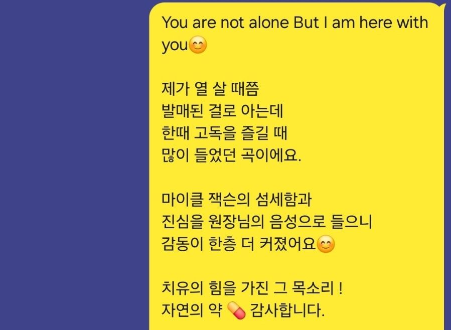 직접 불러주신 마이클 잭슨의 노래에는 모든 단어로도 다 담을 수 없는 온기와 아름다움이 흘렀다. 새로운 삶이 버거울 때마다 다시 돌아가 붙잡게 되는, 보이지 않는 좌표였다.