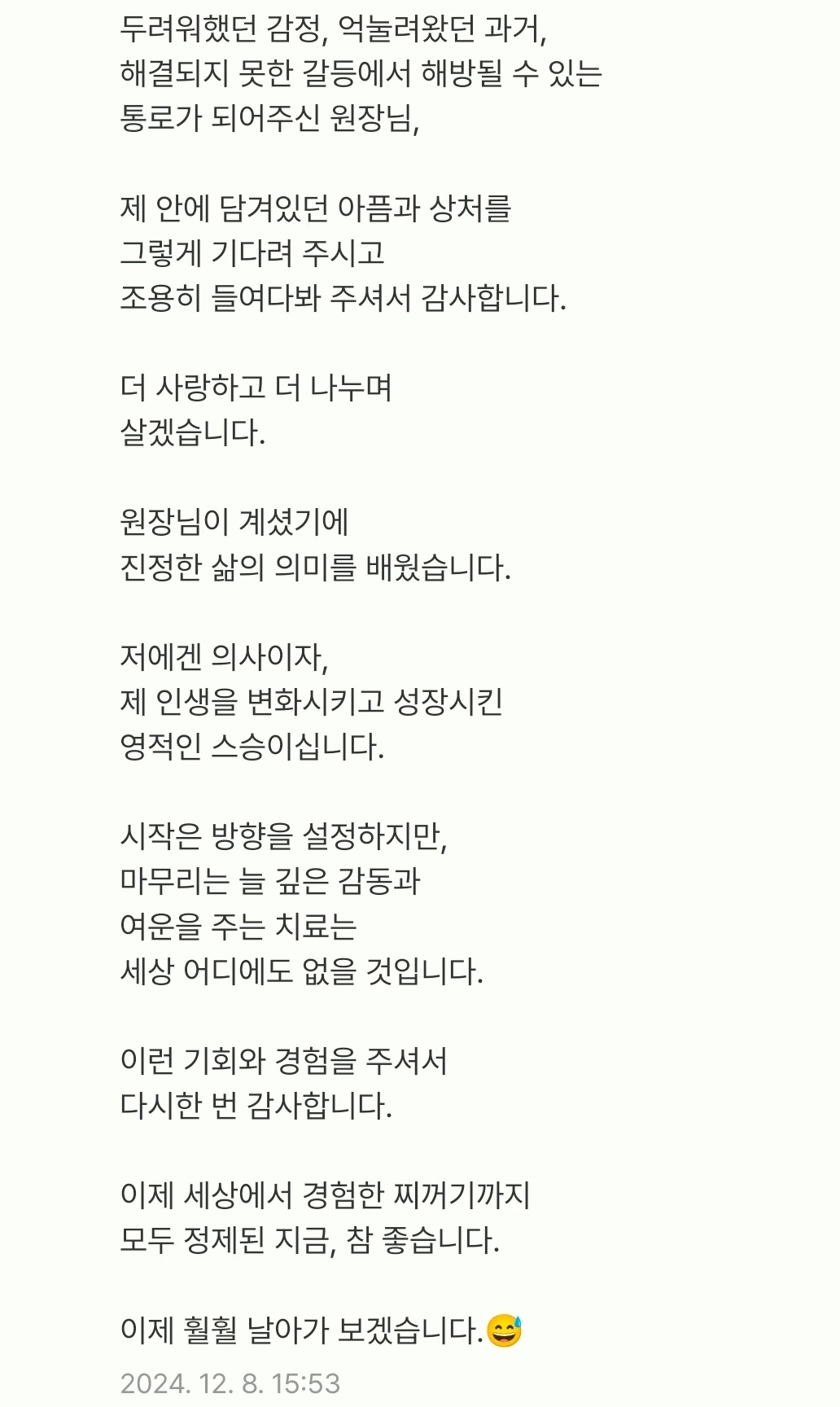좋은 환자를 만나서 제가 좋은 의사로 살 수 있었습니다. 앞으로 제가 생각나지도 않을 만큼 더 건강하고 행복하고 내일 하루하루가 아름다운 지금과 연애하는 그 순간이 지구별 여행하는 동안 끝까지 이어지기를 바랍니다. 늘 응원하겠습니다. 감사합니다.