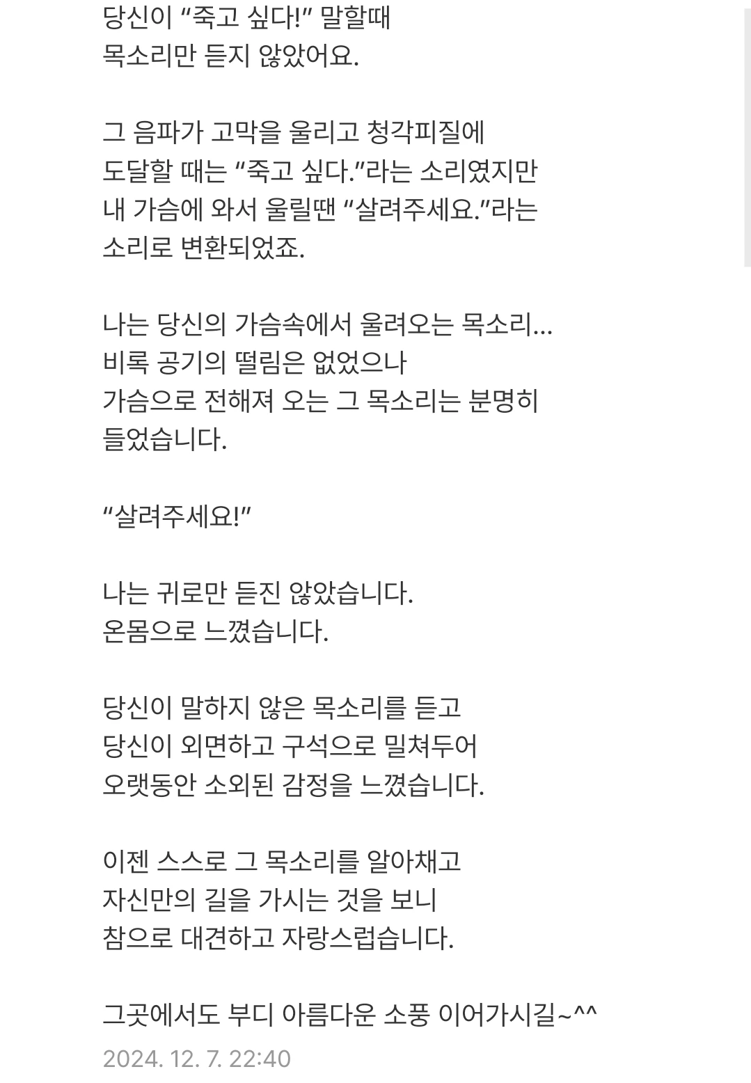 살아 있으려는 쪽에서 나온 소리였어요. 사실은 살고 싶어서 그래서 너무 아팠던 절규였어요. 당신은 그 말을 끝까지 받아주었어요. 앞서 판단하지도 다른 뜻으로 덮어 해석하지도 않았어요. 말의 모양보다 그 아래 깔린 '마음'을 대신 보아주었어요.