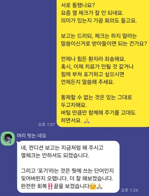 몸을 맡기는 것뿐만 아니라 치료의 여정을 함께 걷고 있다고 생각했고, 힘들다면 마음을 이해하고 싶고, 그분의 결정을 존중할 준비가 되어있음을 전하고 싶었다.
