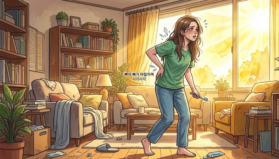 양치하는 중 뒷목에서 돌이 굴러가는 듯한 소리가 났다. 관절 속에서 기포가 터지는 듯 뼈와 뼈가 마찰하며 사각사각, 뚜렷하게 들렸다 사라졌다. 마치 곧 전쟁이 날 것만 같았다. 등은 국소적으로 꽉 잡힌 듯한 통증이 있어 산산이 부서지는 느낌이고, 명치에는 쇳덩이가 박힌 듯한 답답함이 있었다.