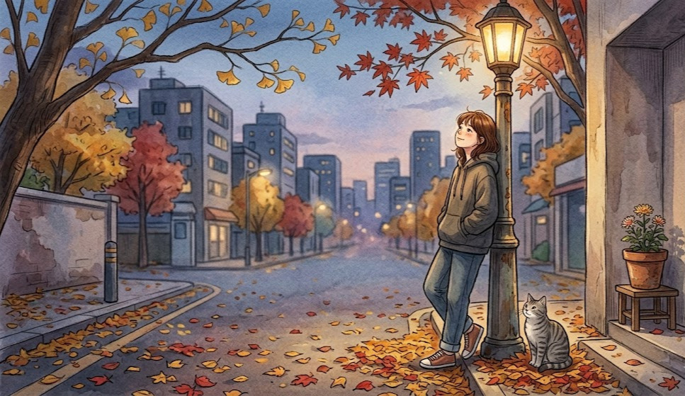 가을의 마지막 페이지가 그렇게 차곡차곡 채워지고 있었다. 오랫동안 흐릿했던 풍경들이 서서히 시야에 들어왔다. 낡은 가로등에 기대 선 나뭇가지, 도로 위에 겹겹이 쌓인 낙엽들, 길모퉁이에 소박히 자리한 작은 화분 하나까지. 고된 시간을 지나며 무심히 스쳐온 장면들이 이토록 깊고 아늑하게 다가오다니.