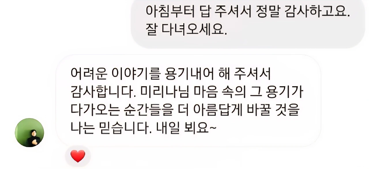 "어려운 이야기를 용기 내어 해 주셔서 감사합니다. 마음속의 그 용기가 다가오는 순간들을 더 아름답게 바꿀 것을 나는 믿습니다. 내일 뵈요."