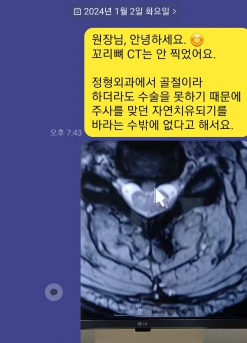 꼬리뼈는 그간 치료 덕인지 아니면 목 통증이 더 강해서인지 잘 느껴지지 않았다. 결국 CT는 찍지 않았다. 영상을 설명하던 의사는 화살표를 가리키며 말했다.