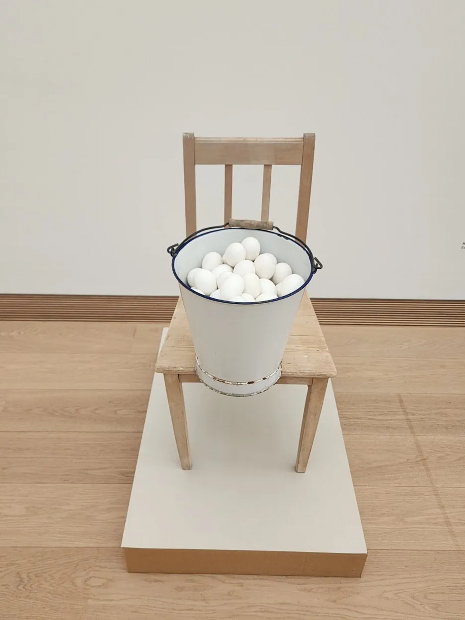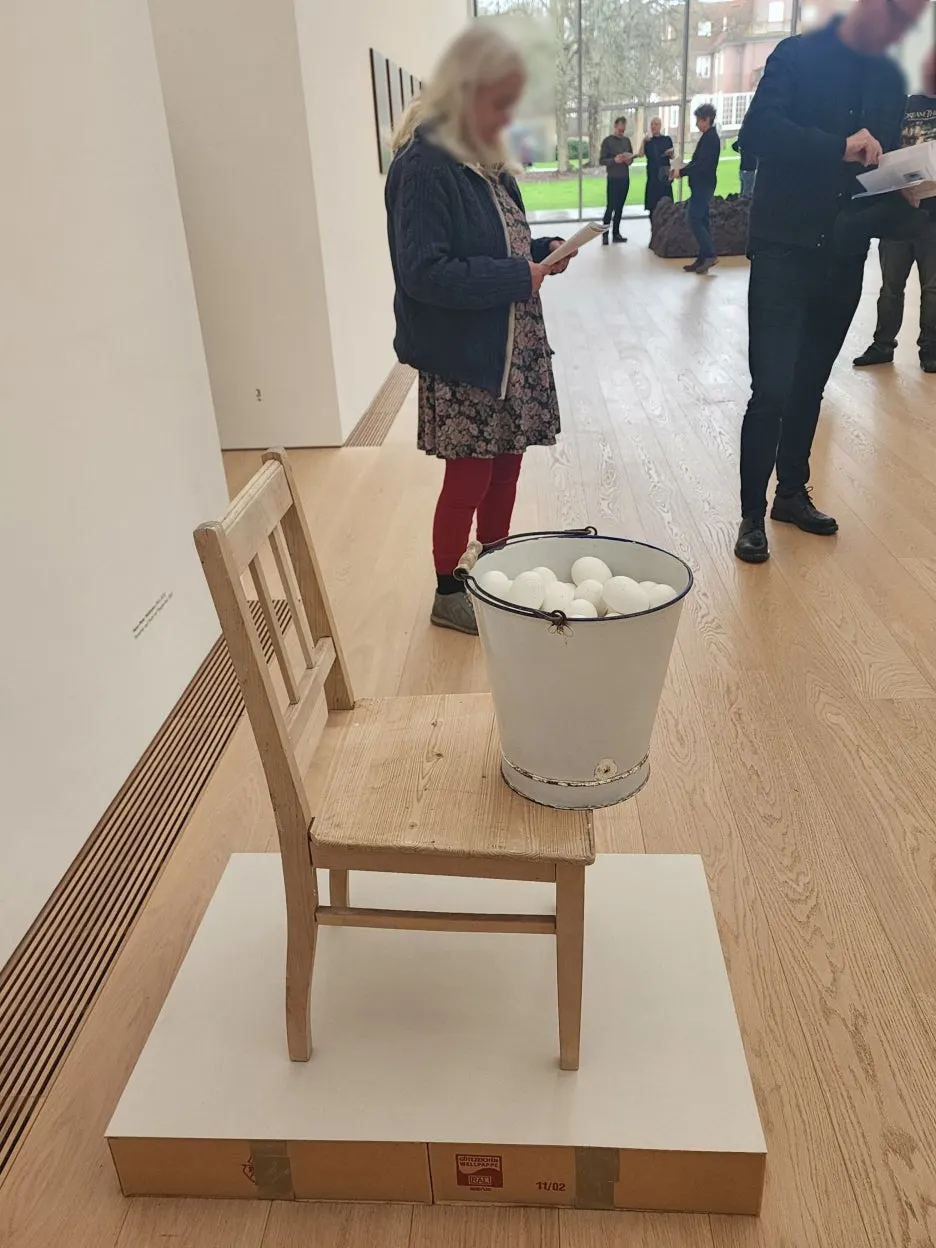 <Eiereimer auf Stuhl mit Pappsockel> 제목을 번역기에 돌려보니 <판지 베이스가 있는 의자 위의 계란 양동이> 라고 한다.
