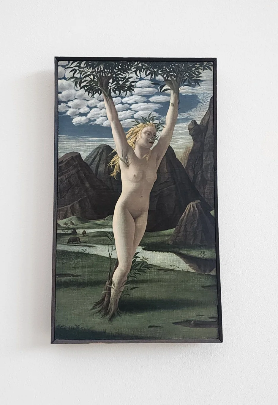 에로스의 사랑의 화살 맞은 아폴론이 처음 본 다프네를 사랑하게 되 쫓아오고 에로스의 또 다른 증오의 화살에 맞은 다프네는 아폴론을 보고 기겁하여 도망가는 아이러니 속에 더이상 도망 갈 곳이 없는 다프네가 아버지에게 요청하여 월계수로 변한다는 신화를 담은 모습