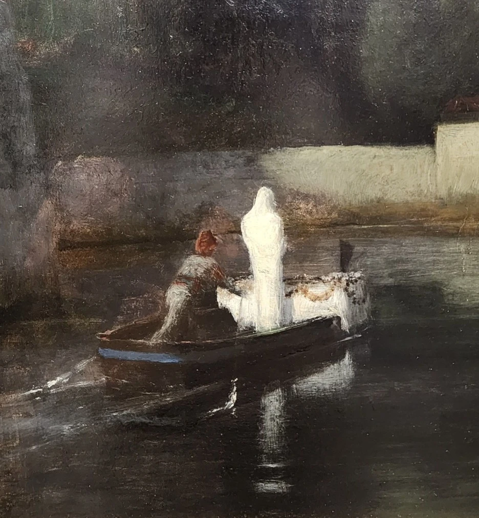 이제 곧 도착할 섬 입구에는 죽은자에 대한 애도의 마음과 순수성을 강조하듯 흰 옷을 머리부터 발끝까지 칭칭 동여맨 미망인이 (미이라의 모습 같기도) 남편의 시신을 죽음의 섬에 헌납하는 듯한 모습으로 나아가고 있다.