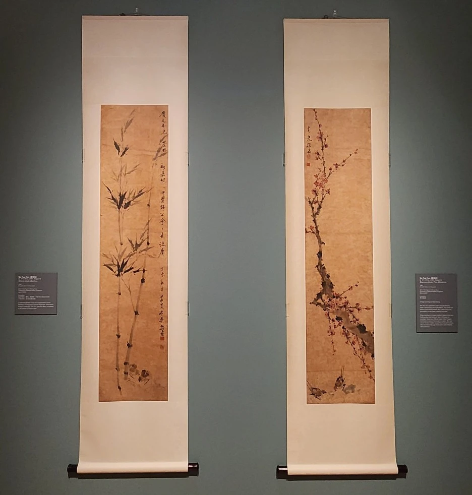 한쪽은 대다무 아래 닭, 다른 한쪽은 매화나무 아래 앵무새.