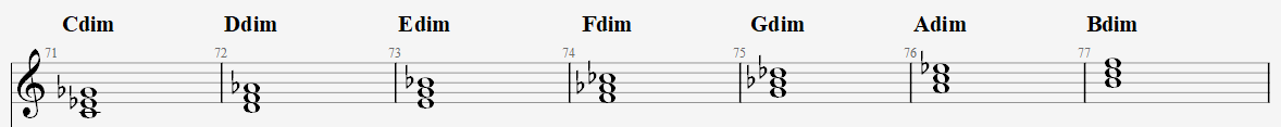 Diminished Chord, 어그먼트와 마찬가지로 디미니쉬드 코드라고 읽어야 하지만 보통 디미니쉬로 불리는 이 코드는 마이너 코드에서 5도 음을 반음 내려주면 나오는 코드이다.