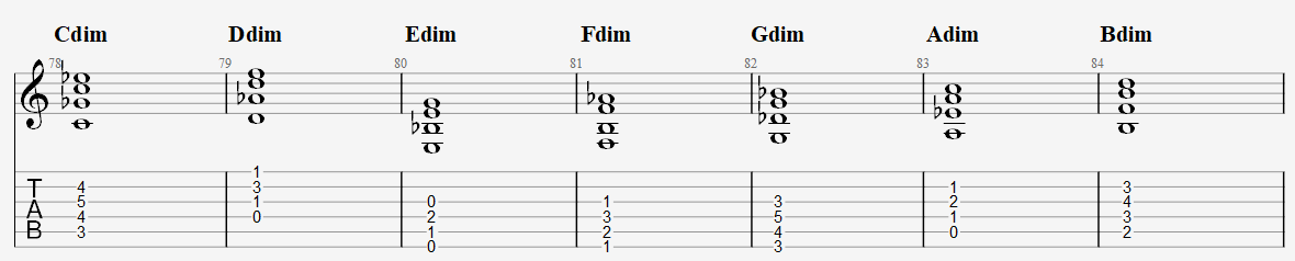 dim 코드 운지표. 안타깝게도 이건 같은 폼을 공유하진 않는다. 다만 비슷할 뿐.